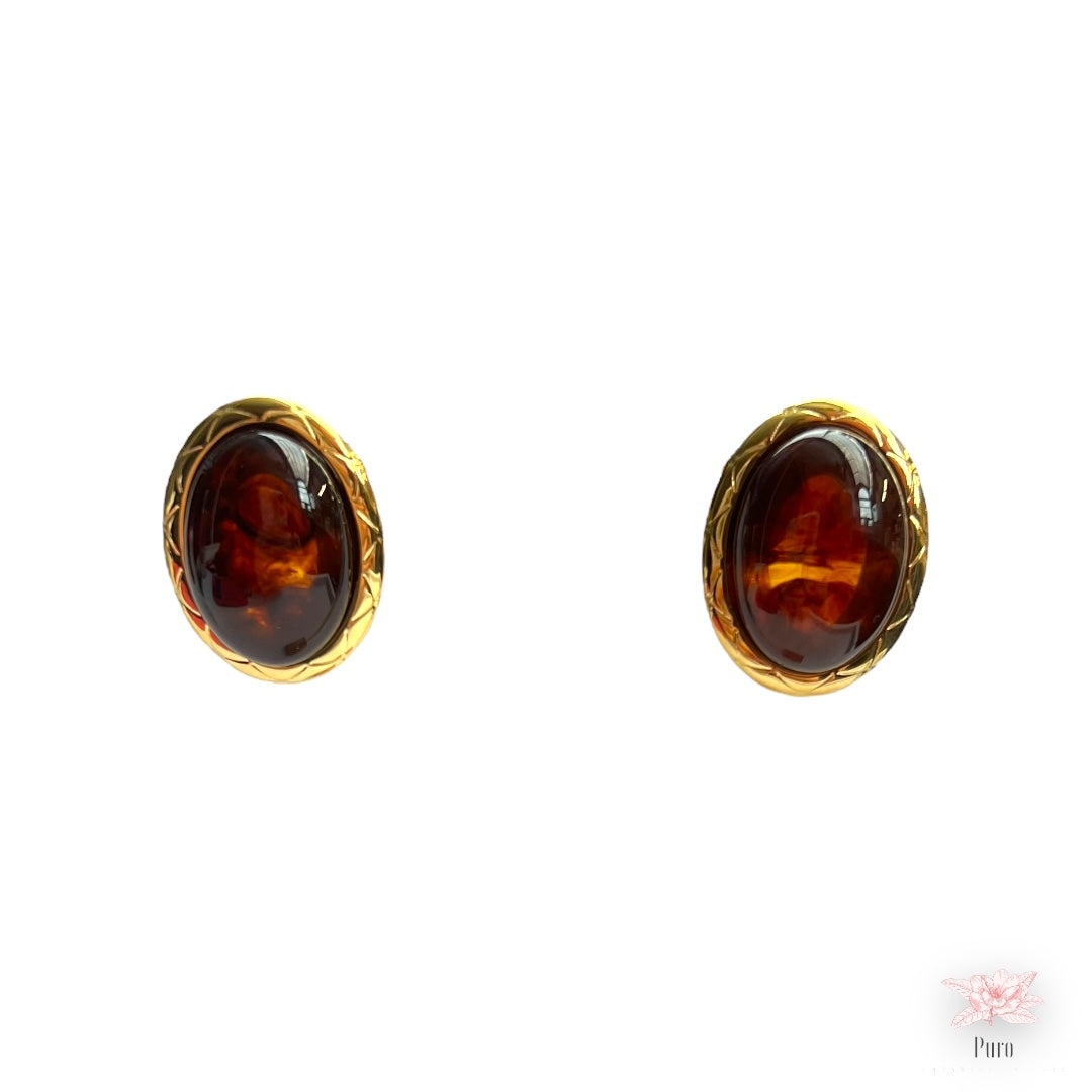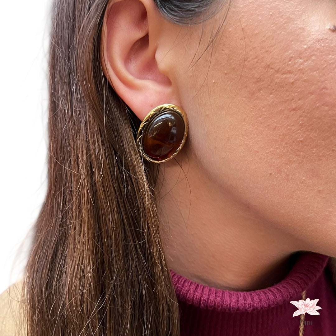 Brincos ovais castanhos com detalhe à volta em dourado texturado.