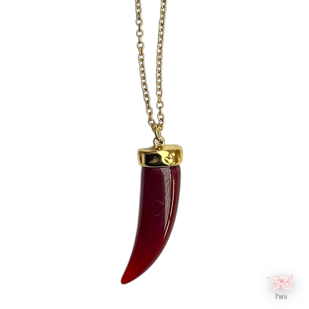 Colar comprido dourado em aço inoxidável com um pendente de um chifre bordeaux, sendo este um amuleto tradicionalmente usado para proteção contra o mau olhado, as energias negativas, simboliza a força e sorte e contra a inveja.