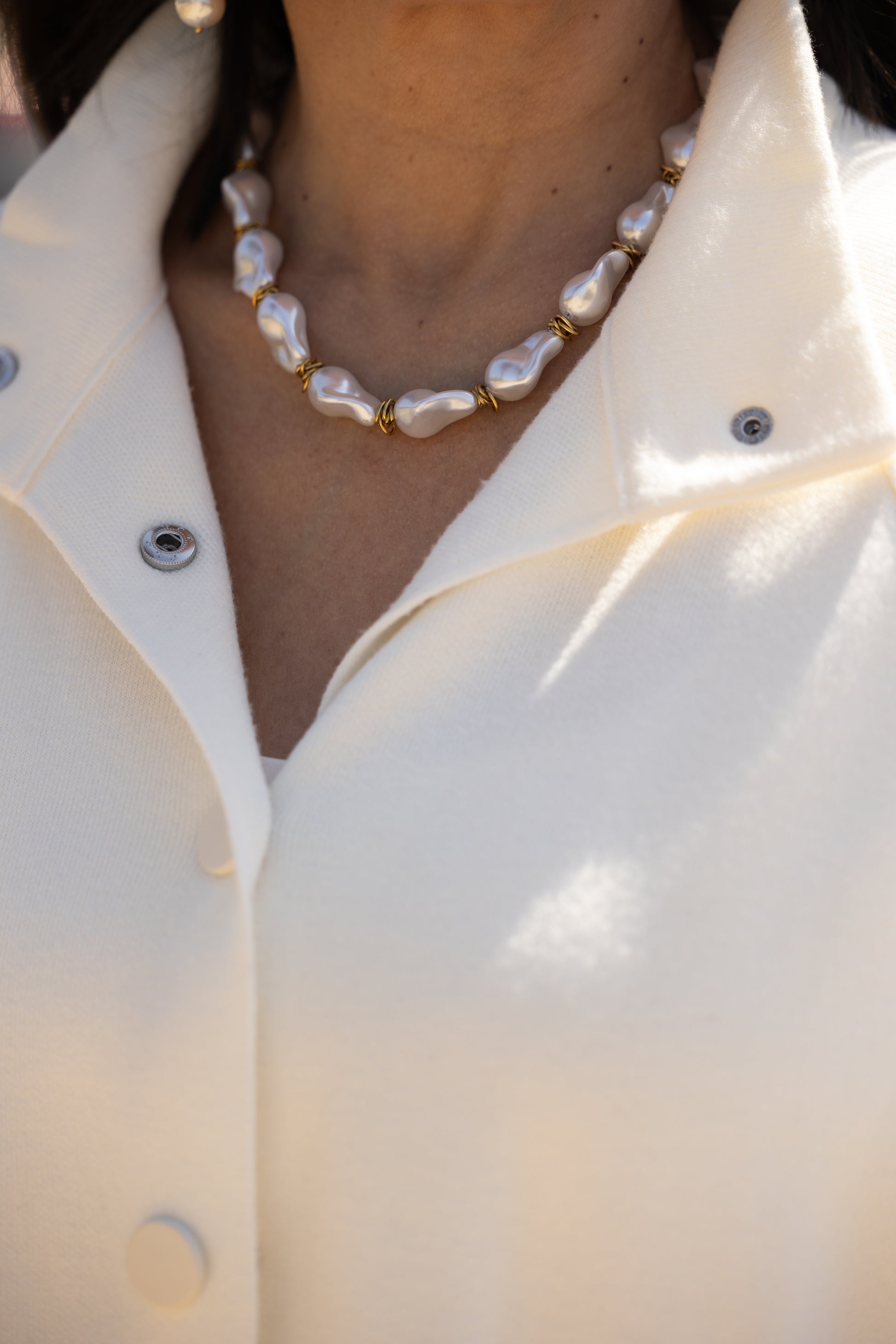 Este colar de pérolas de diferentes tamanhos e formatos, cria um visual único e sofisticado. Os detalhes em aço inoxidável dourado adicionam um toque de brilho e modernidade, o que acaba por contrastar com a beleza clássica das pérolas.
