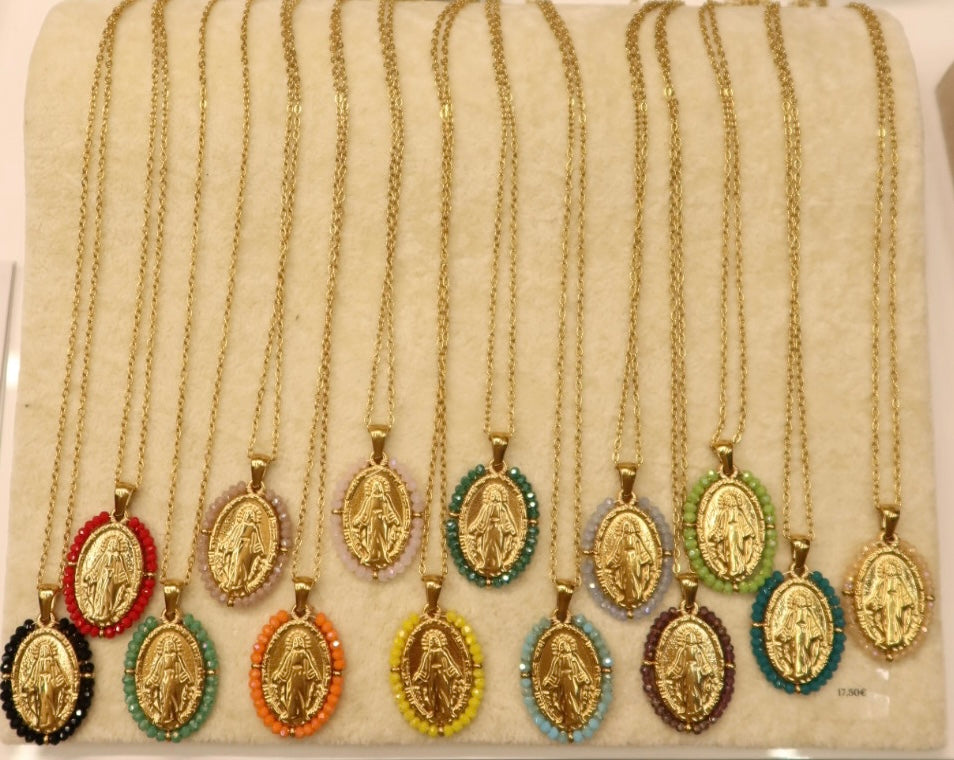 Colar fino em aço inoxidável com um pendente da Santa Milagrosa com contorno de missangas coloridas.