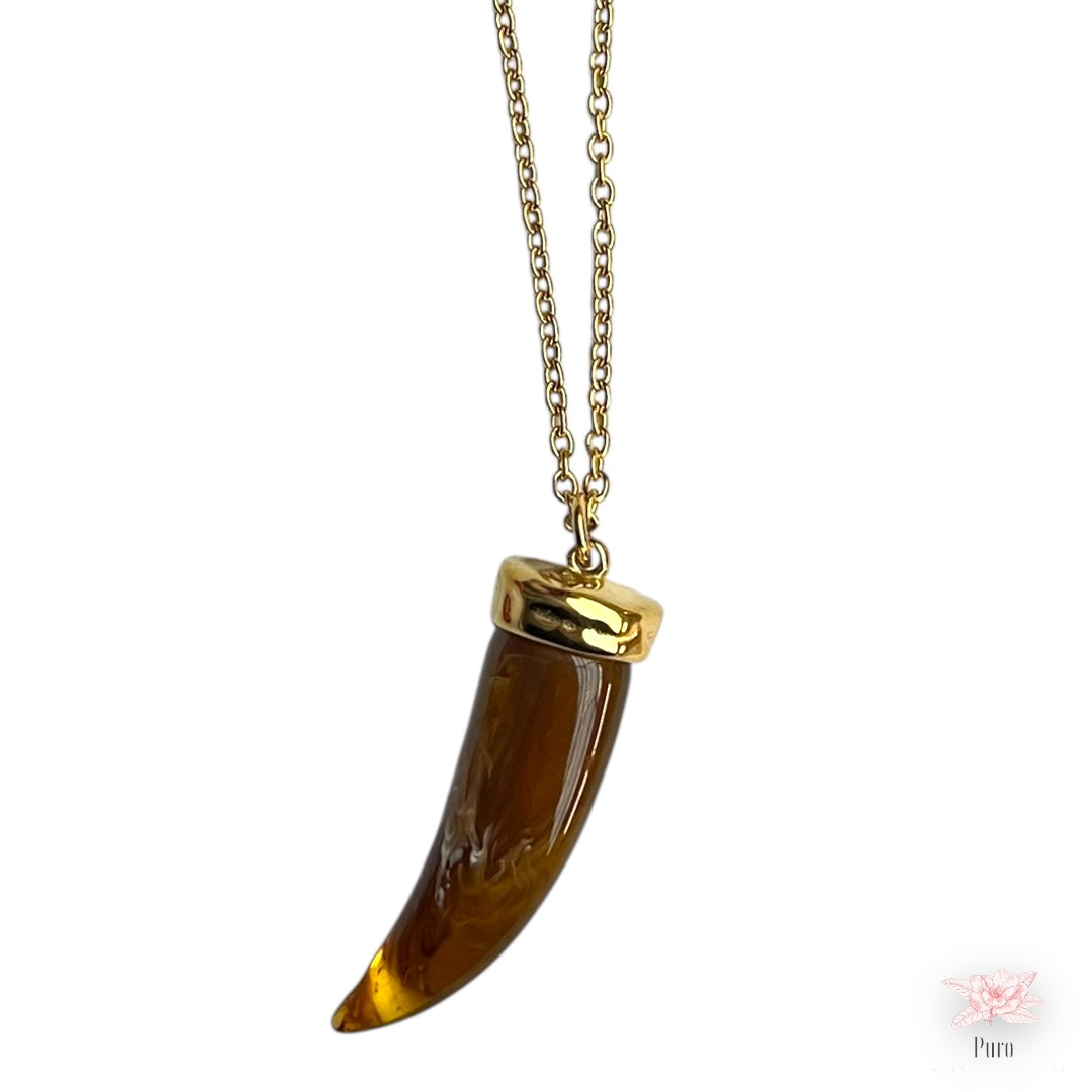 Colar comprido dourado em aço inoxidável com um pendente de um chifre castanho, sendo este um amuleto tradicionalmente usado para proteção contra o mau olhado, as energias negativas, simboliza a força e sorte e contra a inveja.